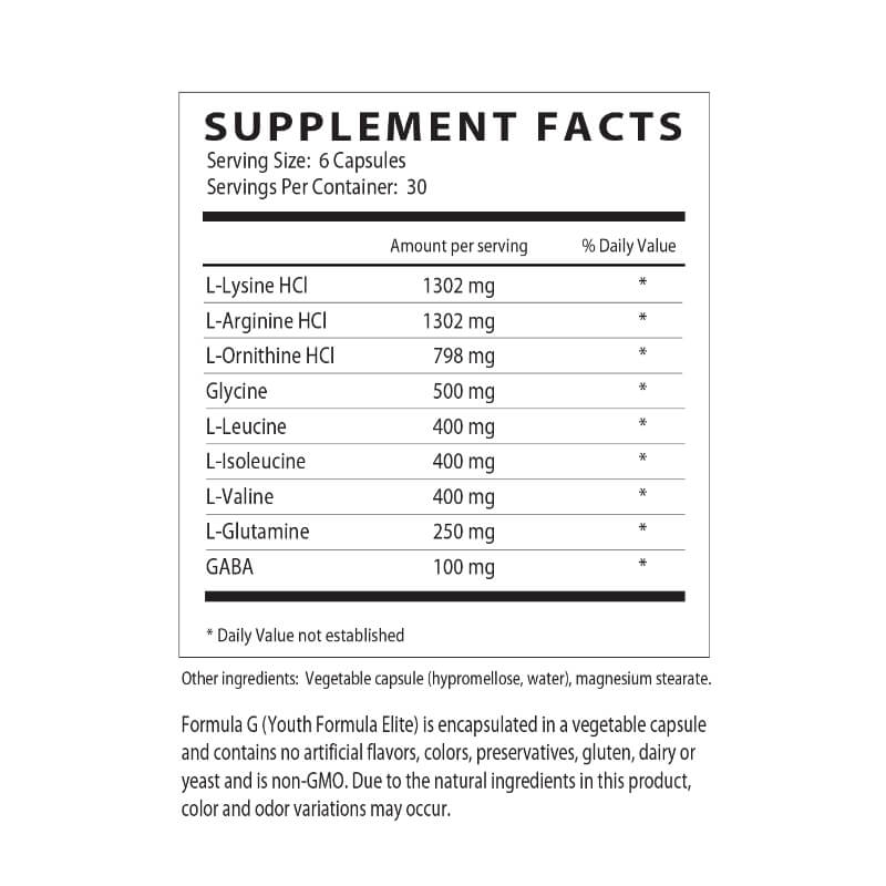 Formula G is an improved nutritional supplement. It is an amino acid stack secretagogue, including the addition of GABA, which, taken orally, stimulates the pituitary gland to produce hGH/Somatotropin. One object is to elevate hGH/Somatotropin release.