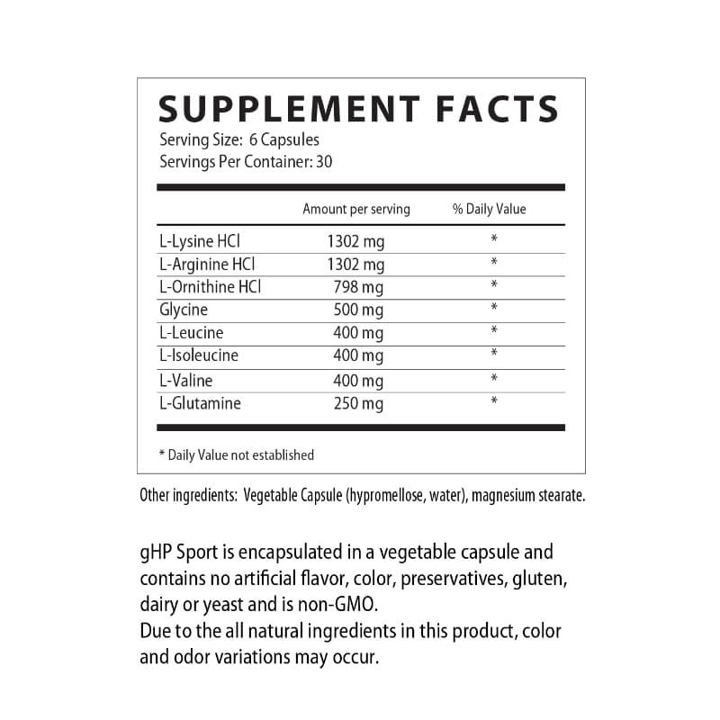 gHP Sport is encapsulated in a vegetable capsule and contains no artificial flavor, color, preservatives, gluten, dairy or yeast and is non-GMO. Due to the natural ingredients in this product, color and odor variations may occur.